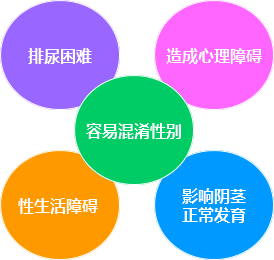 尿道下裂,给站立排尿带来了很大的困难,轻者尿湿裤子,严重者只能像女孩一样蹲着排尿,这类患者往往害怕与其他人一起上厕所,怕被人讥笑,从而产生心理负担。如不及时治疗,将会影响阴茎发育,导致阴茎弯曲畸形,且患儿成年后常不能进行正常的性生活,影响男性正常射精,从而影响了女方的受孕率。