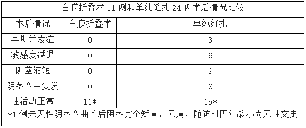 手术前勃起的阴茎无法与地面平行,临床运用阴茎弯曲白膜折叠术,手术后完全改观,勃起的阴茎充分与地面平行,手术中没有其它植入,术后不会产生排斥作用,对阴茎海绵体没有损害,临床康复案例显示术后6周恢复正常性生活。