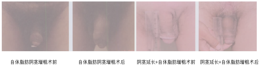 临床实践45例阴茎细小患者,年龄19-72岁,28例实践自体脂肪阴茎增粗术;15例同时实践自体阴茎延长术。所有患者阴茎皮下注射制备好的自体脂肪30-60ml,平均45ml。手术前以软尺测量阴茎冠状沟处周径为8-12cm,手术后90-180天随访测量术前部位,周径为10-16cm,术后周径平均增加2-4cm。1例同时行自体阴茎延长术者,术后脂肪液化,感染,对症治疗后14天痊愈。本组病例中,无术前,术后自述勃起功能障碍。(手术效果图如上图)