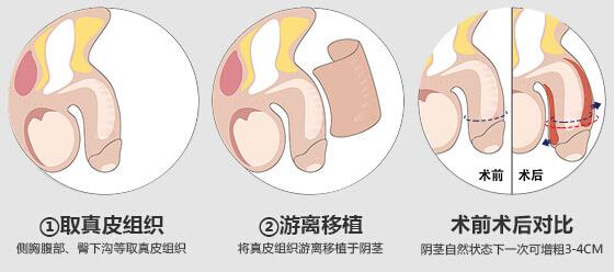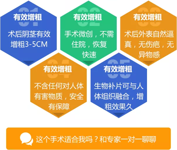 一般平均周长增加2-4cm,不但能使阴茎增粗,同时具有阴茎塑性功能。阴茎上移植的脂肪垫具有阻隔作用,可减低龟头敏感度,延长射精时间。(注:增粗是根据阴茎直径的厘米来算)